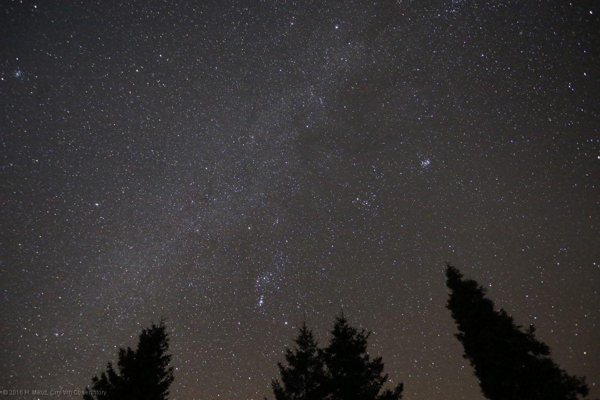 Posnetki nočnega neba z zimskega obiska lokacije Črni Vrh nad Cerknim 29. januarja 2017. Inverzija je segala do 850m nadm. višine. Temperatura -5oC, vlaga 60%, dober seeing in povsem mirno. Izrazito svetlobno onesnaženje z modro svetlobo iz smeri Stari vrh nad Škofjo Loko (smučišče), oddaljeno 9km. Posneto s fotoaparatom Canon 6D na fiksnem stojalu. Dostop z avtom do koče na višini 1280m in nato peš do zgornje postaje šestsedežnice. Foto Herman Mikuž in Andrej Mohar, Društvo Temno nebo Slovenije.