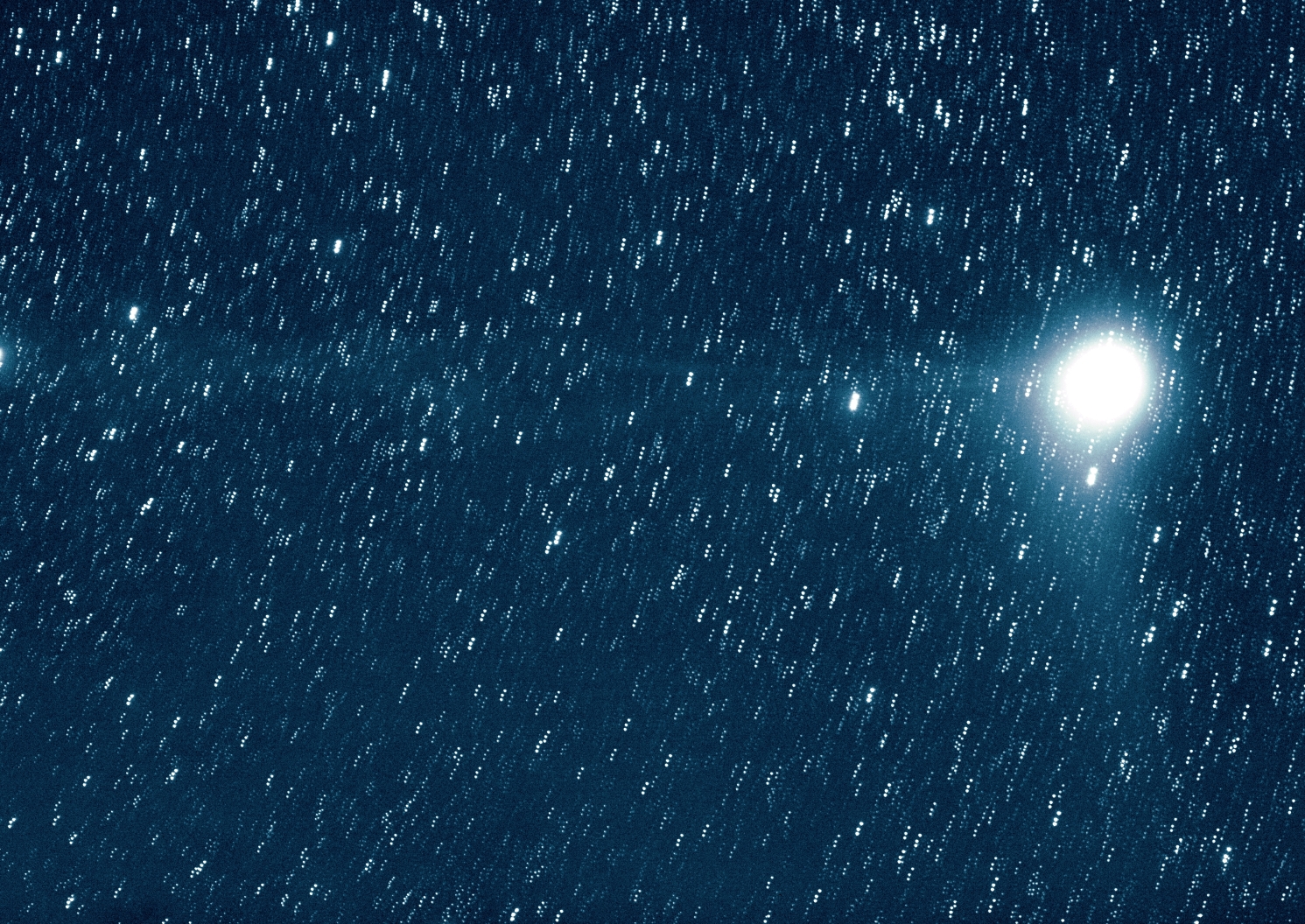 Image scale is 10.6 arc sec/pixel. Field of view is 3.9 by 2.8 degrees. Both, dust and gas tails are clearly visible.