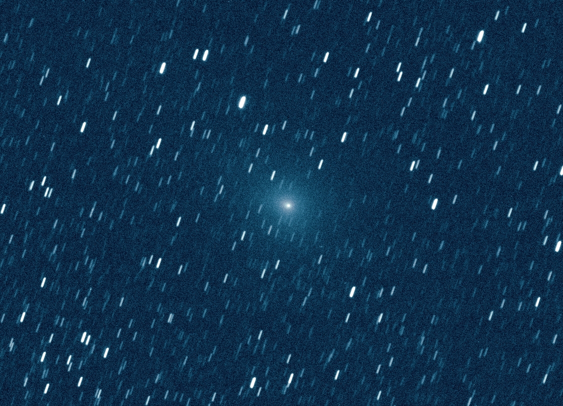 False color image of comet C/2007 E2 (Lovejoy), obtained on 2007 May. 18 (20h17-20h50UT) with 19-cm, f/4 Flat field camera, V filter and CCD. The telescope was programmed to follow the comet sky motion. Image is a composition of 10x180 sec co-addedd exposures. Image scale is 2.43 arc sec/pixel. Copyright © 2007 by J. Zakrajsek, Crni Vrh Observatory.