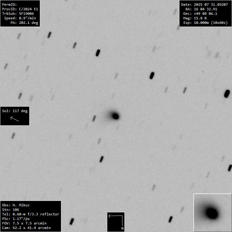 Unfiltered image of comet C/2024 E1 (Wierzchos), obtained on 2025 July 31.892 UT with 60-cm, f/3.3 Deltagraph telescope and CMO.